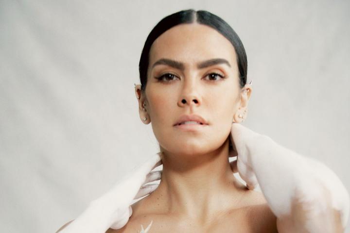 De color marfil, transparente y sin adornos, la prenda está pensada “en contraposición al tejido exterior para aportar delicadeza y una blancura simbólica que se repite en el body painting y en la escultura”, explica el diseñador.