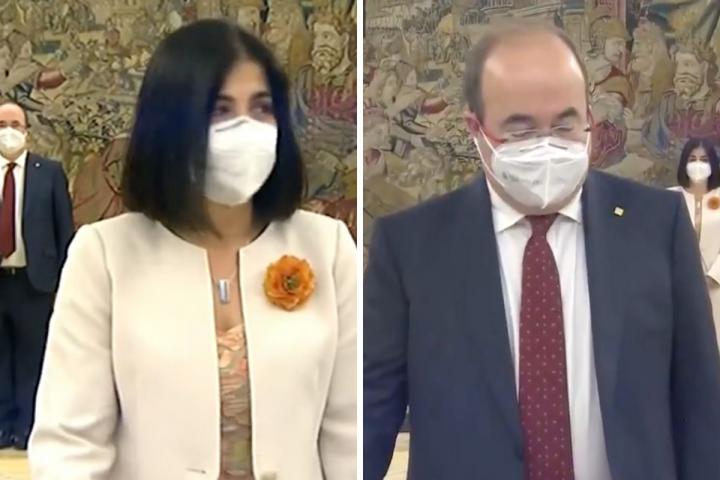 La nueva ministra de Sanidad, Carolina Darias, y el de Política Territorial y Función Pública, Miquel Iceta, han prometido este miércoles sus cargos ante Felipe VI en el Palacio de la Zarzuela con un ejemplar de la Constitución como testigo.