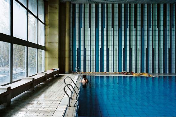 Y cómo no, es gracias a Yoneda que podemos adentrarnos en una piscina municipal de corte soviético, prolijamente engalanada con un mosaico azul, que desde las alturas contempla a dos amantes impacientes demostrándose su amor en el interior de sus aguas.