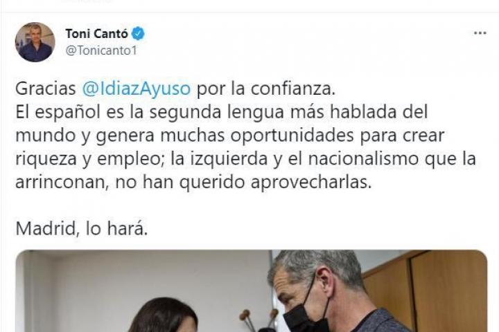 “Gracias @IdiazAyuso por la confianza. El español es la segunda lengua más hablada del mundo y genera muchas oportunidades para crear riqueza y empleo; la izquierda y el nacionalismo que la arrinconan, no han querido aprovecharlas. Madrid, lo hará”, había escrito literalmente.