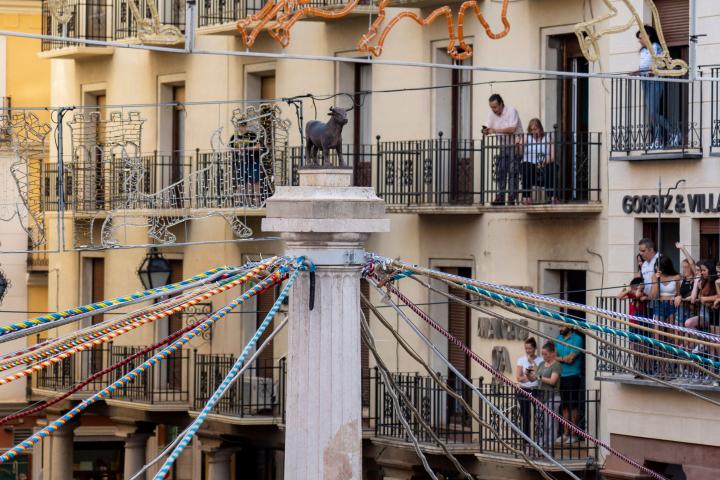 Teruel acogió del 13 al 19 de junio pasados el XVII Congreso Nacional del Toro de Cuerda, en el marco del cual se engalanó la plaza del Torico con 23 sogas (una por cada municipio participante), que partían de las fachadas de la plaza y convergían en la columna que preside la fuente.