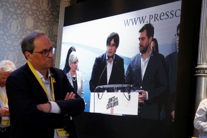 El presidente catalán, Quim Torra, ha vuelto a colgar este lunes en el balcón del Palau de la Generalitat la pancarta a favor de los “presos políticos y exiliados”, con un lazo amarillo, una vez terminado el ciclo electoral.