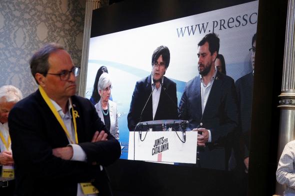 El presidente catalán, Quim Torra, ha vuelto a colgar este lunes en el balcón del Palau de la Generalitat la pancarta a favor de los “presos políticos y exiliados”, con un lazo amarillo, una vez terminado el ciclo electoral.