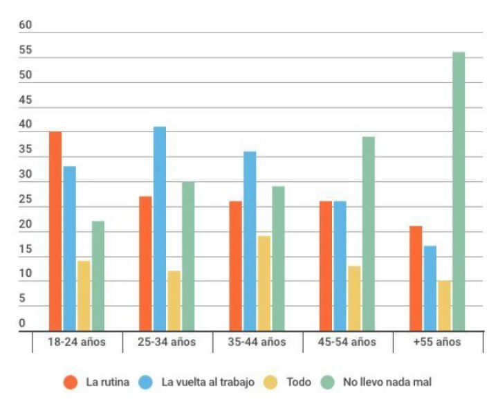 A los jóvenes les cuesta un poco más: un 24% de los encuestados entre 18 y 24 años llega deprimido a este momento y es recuperar la rutina lo que más les cuesta. El caos y la improvisación impera más a esta edad y de ahí que el 40% de los preguntados dice que lleva fatal recuperar el orden y los horarios, aunque puede que su falta de previsión también tenga algo que ver con esa sensación de depresión.