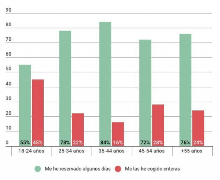 Con la edad aumenta la previsión y también la necesidad de distribuirse los días libres a lo largo del año. Los que más días libres se guardan son los que tienen entre 35 y 44 años: un 84% de los encuestados de esta franja de edad no ha agotado sus vacaciones.