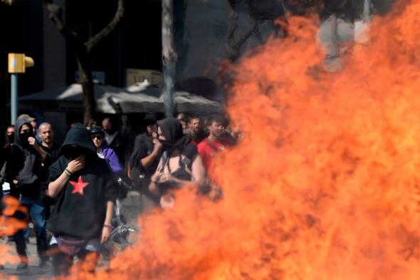 Pasadas las 13 horas, los servicios municipales han limpiado la zona de la calle Tarragona donde se había formado una hoguera a mediodía con contenedores, vallas y material de obra, provocada por una parte de los movilizados en contra del acto de Vox.