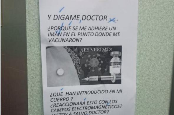 Como se puede ver en la foto que ha subido a Twitter, en el letrero en cuestión se podía leer: “Y dígame, doctor, ¿por qué se me adhiere un imán en el punto donde me vacunaron? ¿Qué han introducido en mi cuerpo? ¿Reaccionará esto con los campos electromagnéticos? ¿Estoy a salvo, doctor?”