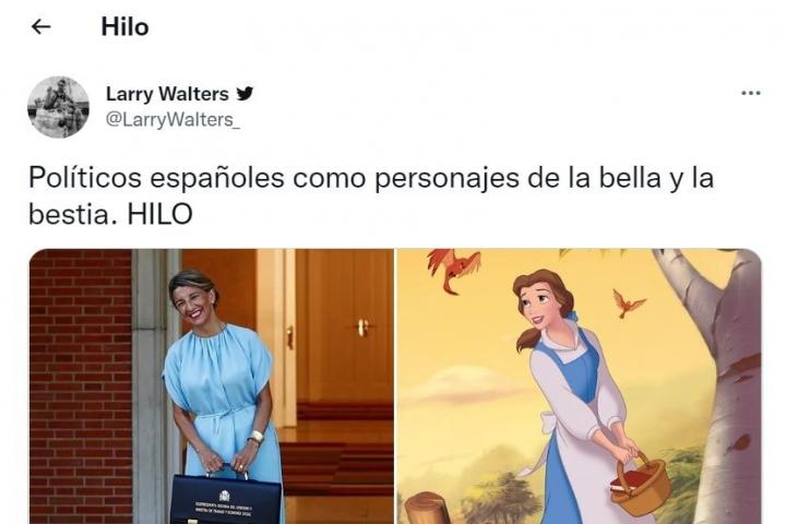 Ante las dudas sobre la supervivencia de la plataforma que dirige Elon Musk, la usuaria Larry Walters ha arrasado con un hilo en el que compara a algunos políticos españoles con varios personajes de la película de DIsney La Bella y la Bestia.