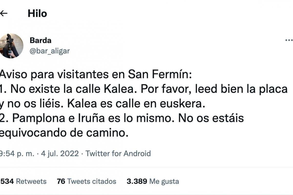 Con motivo del inicio de esta fiesta, que congrega en pocos días a cientos de miles de personas en Pamplona y alrededores, una usuaria de Twitter ha compartido un decálogo que está teniendo mucho éxito en la red social del pájaro azul con consejos de civismo y de respeto durante las celebraciones.