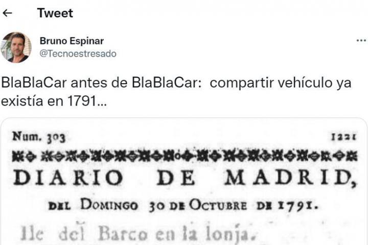 “BlaBlaCar antes de BlaBlaCar: compartir vehículo ya existía en 1791…”, ha señalado en el tuit, junto al texto, fechado el 30 de octubre de 1791. En él se avisa a los lectores que “el martes próximo sale un coche para la Ciudad de León con dos personas decentes”.