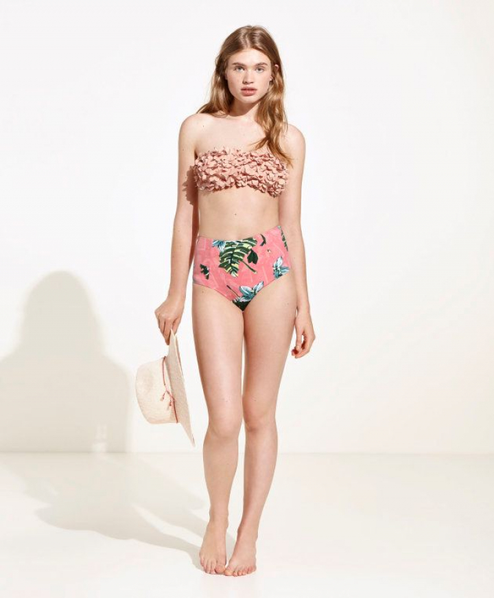 Si tu silueta es recta (con la misma anchura de pecho, cintura y caderas) y buscas compensarlo, hazte con bikinis que den el efecto de mayor volumen en pecho y caderas. ¿Cómo? Por ejemplo con braguitas que se cierre con lazos en los laterales o tops cubiertos de volantes.