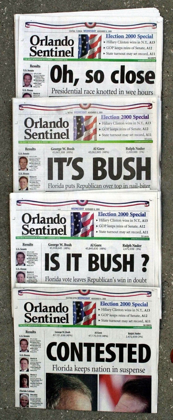 Tras días y días de polémica, se afirmó que Bush había ganado, solamente por 537 votos. Pero no sin polémica: tres jueces del panel de recuento -dos de ellos conservadores- decidieron que no habría más sumas ni revisiones de papeleras, ante las condiciones de seguridad (las manifestaciones en las calles eran constantes) y la falta de tiempo para ello.