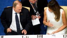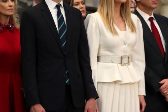 Trump y Hunt conversaron unos breves minutos mientras la primera dama, que iba con gafas y traje falda de color azul, acompañado por una blusa blanca, azul y roja, era saludada por el embajador.