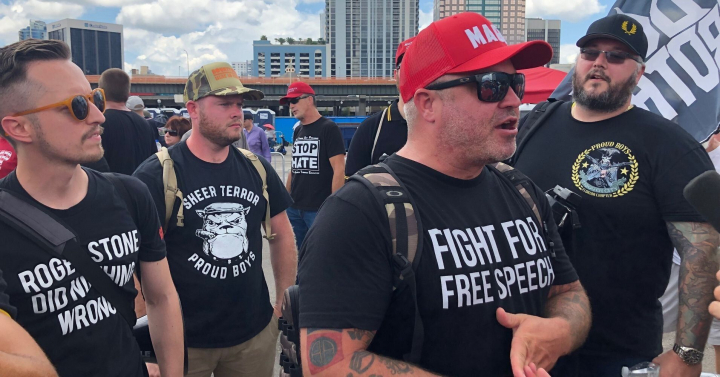 “Cuando entras aquí, es una hermandad. Es una familia. Es como estar en un resurgimiento, tío”, decía Joe Biggs, miembro de los Proud Boys, a otro activista de extrema derecha en referencia al acto de Trump.
