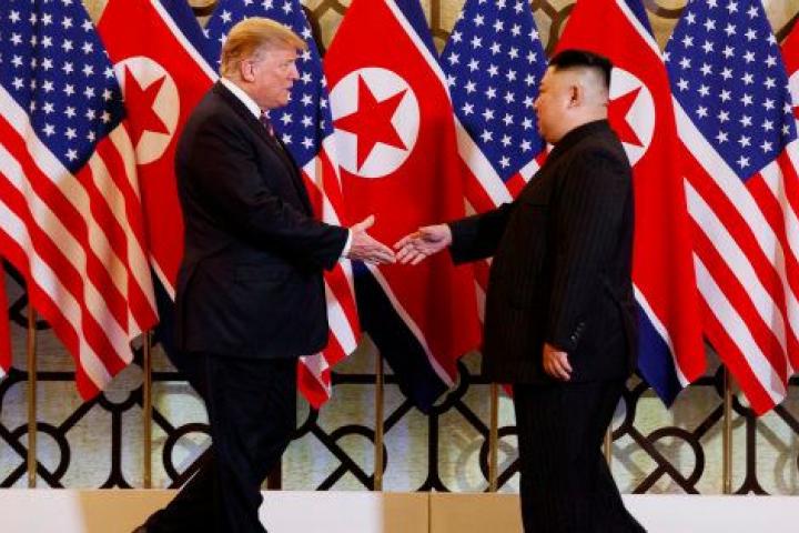 Sonrientes y relajados, Trump y Kim se estrecharon la mano durante unos nueve segundos frente a un fondo formado por seis banderas estadounidenses intercaladas con otras seis norcoreanas, en el céntrico hotel Sofitel Metropole de Hanói, de nuevo un establecimiento no oficial, terreno neutral.