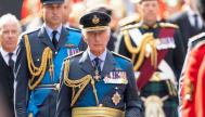 Los hijos y nietos de la reina saludan al féretro a su paso. El rey Carlos III, la princesa Ana y el príncipe Guillermo, con saludo militar; el príncipe Andrés y Harry, vestidos de civil, inclinan la cabeza en se&ntil...