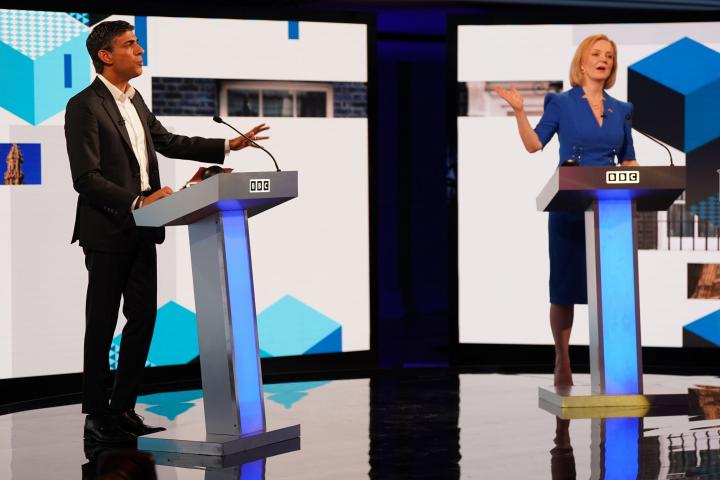 Rishi Sunak y Liz Truss, candidatos a suceder a Boris Johnson en la jefatura del Gobierno británico, han protagonizado este lunes un áspero debate con continuas interrupciones, en el que las mayores discrepancias han llegado por cuenta de sus planes en política fiscal.