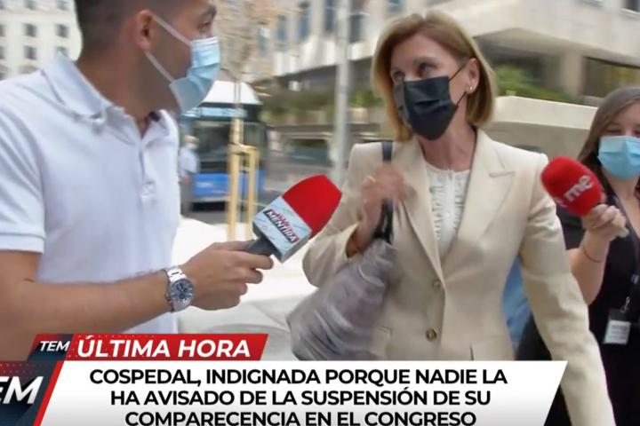 El periodista Fabián Pérez le ha preguntado si le habían dado “algún motivo” para cancelar la comparecencia, ante lo que ha respondido con un tajante “no”. El reportero ha procedido a explicarle los motivos de la decisión: ”¿Sabe que es, a priori, porque los grupos han votado porque coincidía con su imputación?”. Cospedal ha reaccionado afirmando que nadie le había advertido. “Que no me han dado ningún motivo, le estoy diciendo”, ha insistido.