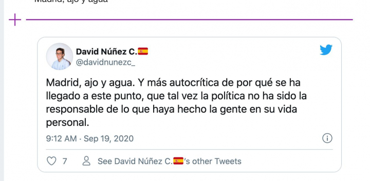 El mensaje tiene tela. No contento con el ‘fastidiaos’ inicial, el joven miembro de NNGG ha culpado a los ciudadanos de las altas cifras de contagios en Madrid y ha restado responsabilidades a los mandatarios. “Tal vez la política no ha sido la responsable de lo que haya hecho la gente en su vida personal”, ha escrito en consonancia con lo que dijo el viernes Isabel Díaz Ayuso, al recordar en la rueda de prensa que los contagios eran la mayoría en el ámbito privado.