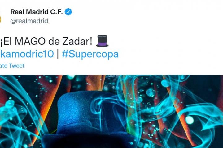 Después de que el croata Luka Modric firmase un excelente gol desde la frontal del área, tras una buena jugada del Madrid, el club galáctico ha publicado un fotomontaje que acompaña al siguiente texto: ”¡El MAGO de Zadar!”.