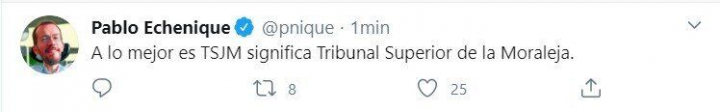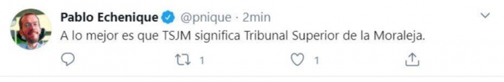 Pedro Sánchez, la propia Díaz Ayuso, Martínez-Almeida, concejales... y también Pablo Echenique, que ha sorprendido por su frase sobre (o en contra) el Tribunal Superior de Justicia de Madrid. Eso sí, el comentario le ha costado algún disgusto en Twitter: hasta tres veces ha intentado sacar el tuit perfecto. Las cosas de pulsar antes de tiempo.