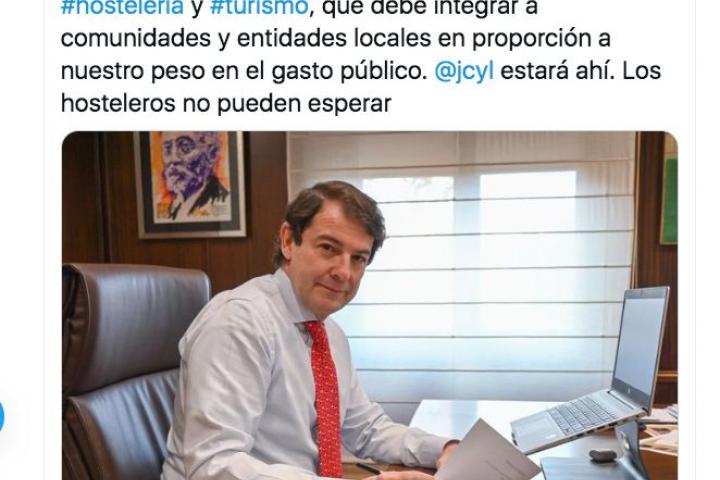 Alfonso Fernández Mañueco, presidente de Castilla y León, publicó este jueves un mensaje en su cuenta oficial de Twitter en el que anunciaba que había pedido por carta al presidente del Gobierno, Pedro Sánchez, “un plan de apoyo nacional con ayudas directas para hostelería y turismo” para las comunidades por el coronavirus.