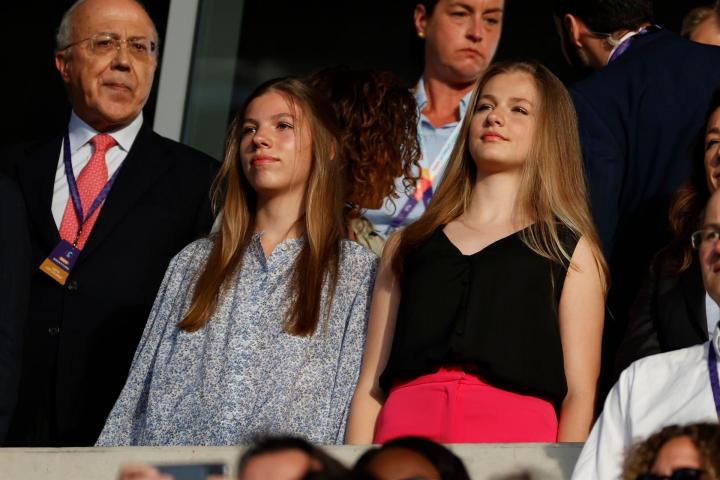 TVE, encargada de retransmitir el partido, ha enfocado en varias ocasiones antes del inicio del encuentro a Leonor y Sofía. Primero cuando las futbolistas han saltado al campo, cuando las hemos visto aplaudiendo. Después, escuchando el himno de España.