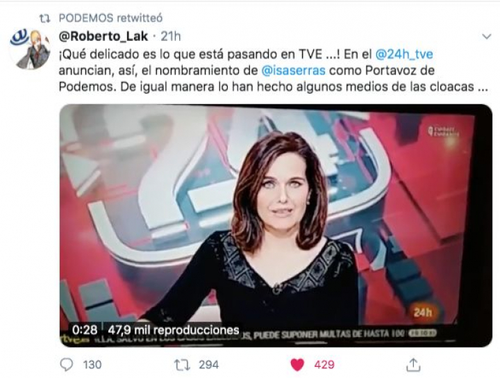 Podemos comparte un tuit crítico con TVE por esta información sobre Isa Serra