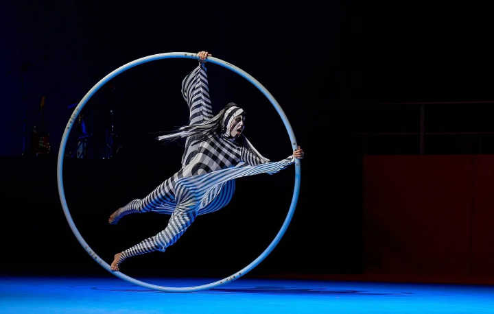 Entre todos ellos hay un número magnífico. El de la rueda cyr de Ariadna Gilabert. Un número que hace vestida con una maya ajustada y con alas de blanco y negro, incluida la cara. Como una especie de arlequín actualizado. Personaje enigmático que ha recorrido diversos momentos del espectáculo desde el inicio, poniendo orden a las fieras del circo con su látigo. Un personaje que por su falta de colorido genera curiosidad y mantiene a raya hasta los payasos que pretenden acosarla.