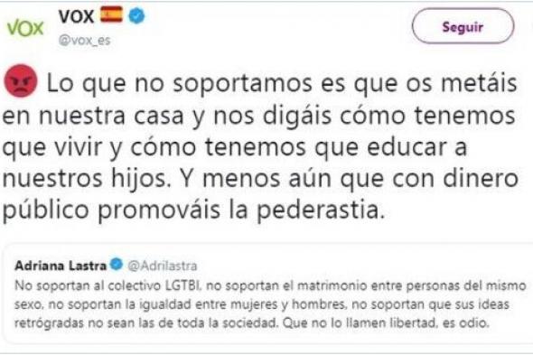 El bloqueo temporal de la cuenta está basado en un mensaje, de una conversación más larga, en el que el partido de Santiago Abascal contesta a la socialista Adriana Lastra diciendo que lo que no soporta Vox es que con dinero público se promueva la “pederastia”, en referencia al programa Skolae en Navarra, donde Gobierna el PSOE.