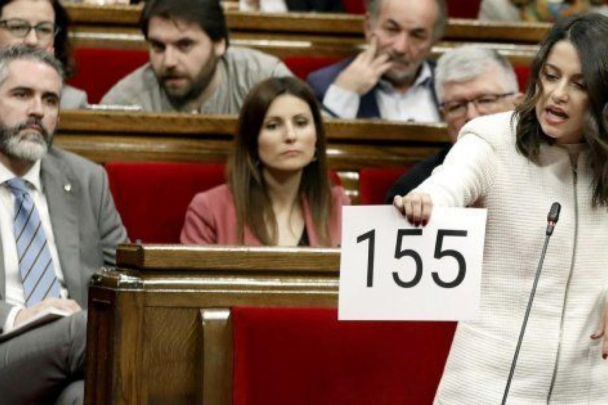 Inés Arrimadas, portavoz de Ciudadanos en el Parlament de Cataluña, protagonizó este miércoles una de las imágenes de la sesión de control al Govern de Quim Torra al enseñar un cartel con el 155 escrito en él.