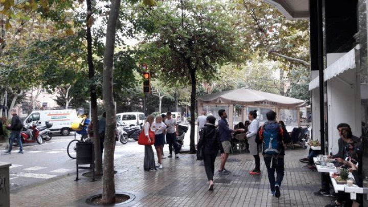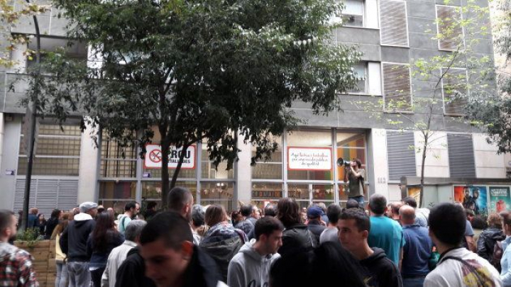 Aunque los votantes son los mismos y las garantías del "referéndum" son si cabe menores que en el 2014, el ambiente parece algo más crispado que el que se vivió hace tres años durante el 9-N. Un chaval grita consignas delante del colegio con un megáfono, animando a los votantes a no marcharse y proteger el colegio. Veo a un par de mossos observar pasivamente la escena. No muy lejos de aquí, en la calle Pau Clarís, me consta que a una chica un policía le ha roto varios dedos al intentar desalojarla del colegio.
