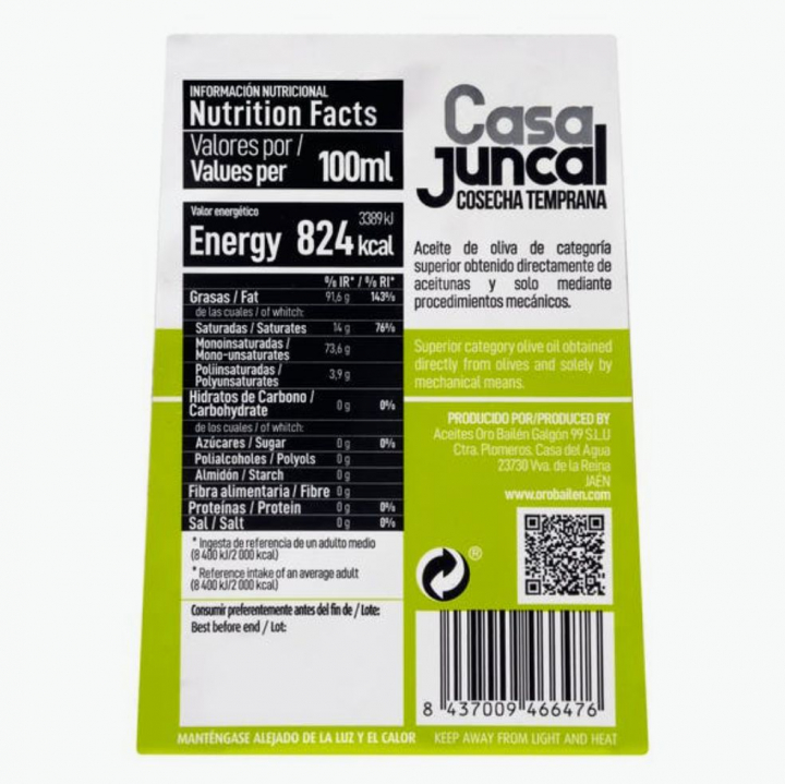 Información nutricional del aceite de oliva virgen extra Casa Juncal.MERCADONA