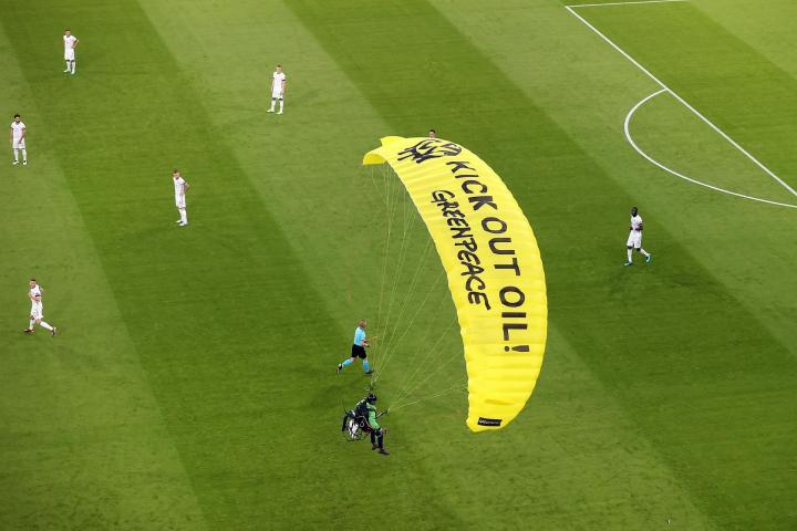 Greenpeace quería protestar con esa acción contra Volkswagen, uno de los patrocinadores de la Eurocopa. A través de mensajes en su cuenta de Twitter, Greenpeace instó al consistorio automovilístico a dejar de vender coches con motores de combustión que perjudican el clima y el medio ambiente.
