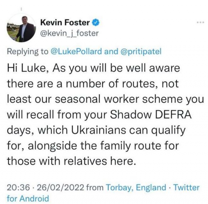 Kevin Foster, secretario de Estado de Inmigración del Reino Unido, la ha liado pero bien con un mensaje publicado en su cuenta de Twitter en el que animaba a los refugiados ucranianos que huyen de la invasión de Rusia a ser temporeros en su país recogiendo verdura y fruta.