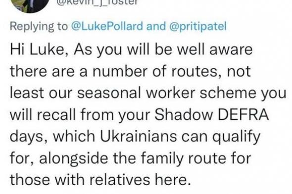 Tuit del secretario de Estado de Inmigración de Reino Unido animando a los refugiados ucranianos a ser temporeros.EL HUFFPOST