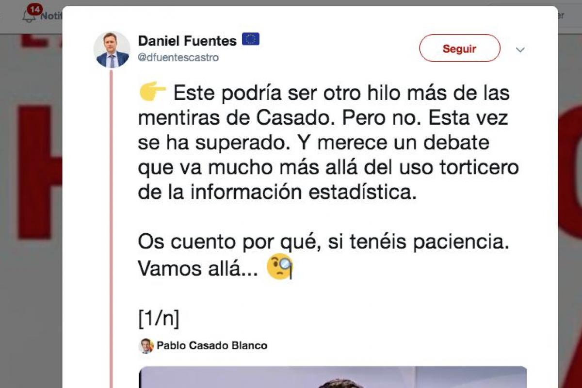 “Este podría ser otro hilo más de las mentiras de Casado. Pero no. Esta vez se ha superado. Y merece un debate que va mucho más allá del uso torticero de la información estadística. Os cuento por qué, si tenéis paciencia. Vamos allá...”, escribió Fuentes, en un hilo de mensajes que acumula más de 7.000 retuits y más de 6.000 ‘me gusta’ en menos de 24 horas.
