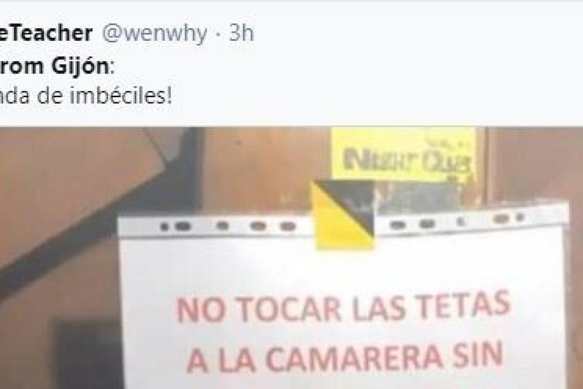 El bar Saurom de Gijón ha pedido perdón por un cartel que habían colgado en la barra del local y que ellos mismos subieron a las redes sociales. “No tocar las tetas a la camarera sin desinfectarse antes las manos”, se podía leer en el letrero.