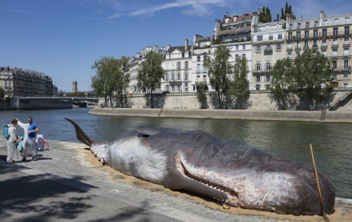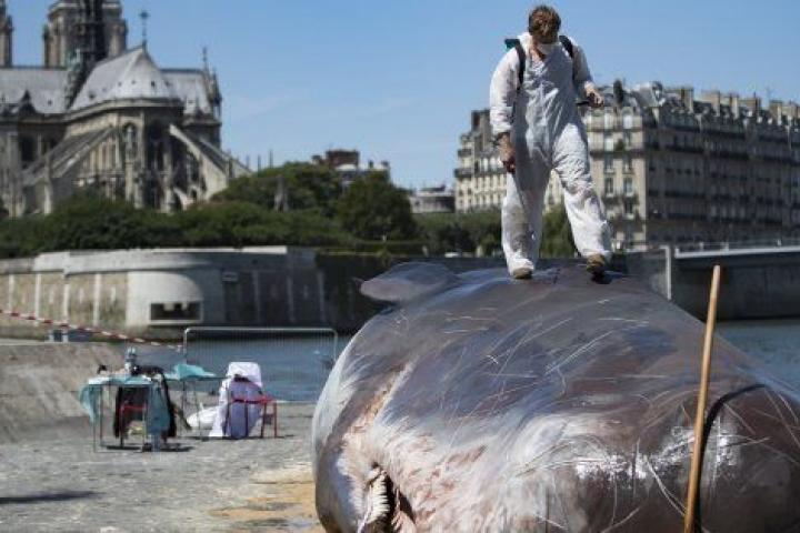 El cuerpo sin vida de un "cachalote" apareció en París, en el borde del río Sena y a pocos metros de la catedral de Notre Dame, encallado por un colectivo de artistas que con esa escultura hiperrealista quisieron concienciar sobre el cambio climático y la pesca intensiva.