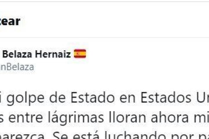 “Señores, ni golpe de Estado en Estados Unidos como los progres entre lágrimas lloran ahora mismo ni nada que se le parezca. Se está luchando por parte de una gran parte del valiente pueblo americano por preservar la DEMOCRACIA y que se demuestre un fraude electoral cantado”, ha escrito.