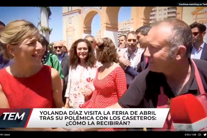 “Momento en el que Pedro, casetero de la Feria de Abril, se reconcilia con @Yolanda_Diaz_ y que hemos visto en @todoesmentiratv: “Lo que usted quiera’”, ha asegurado Pérez en Twitter con un vídeo del momento.