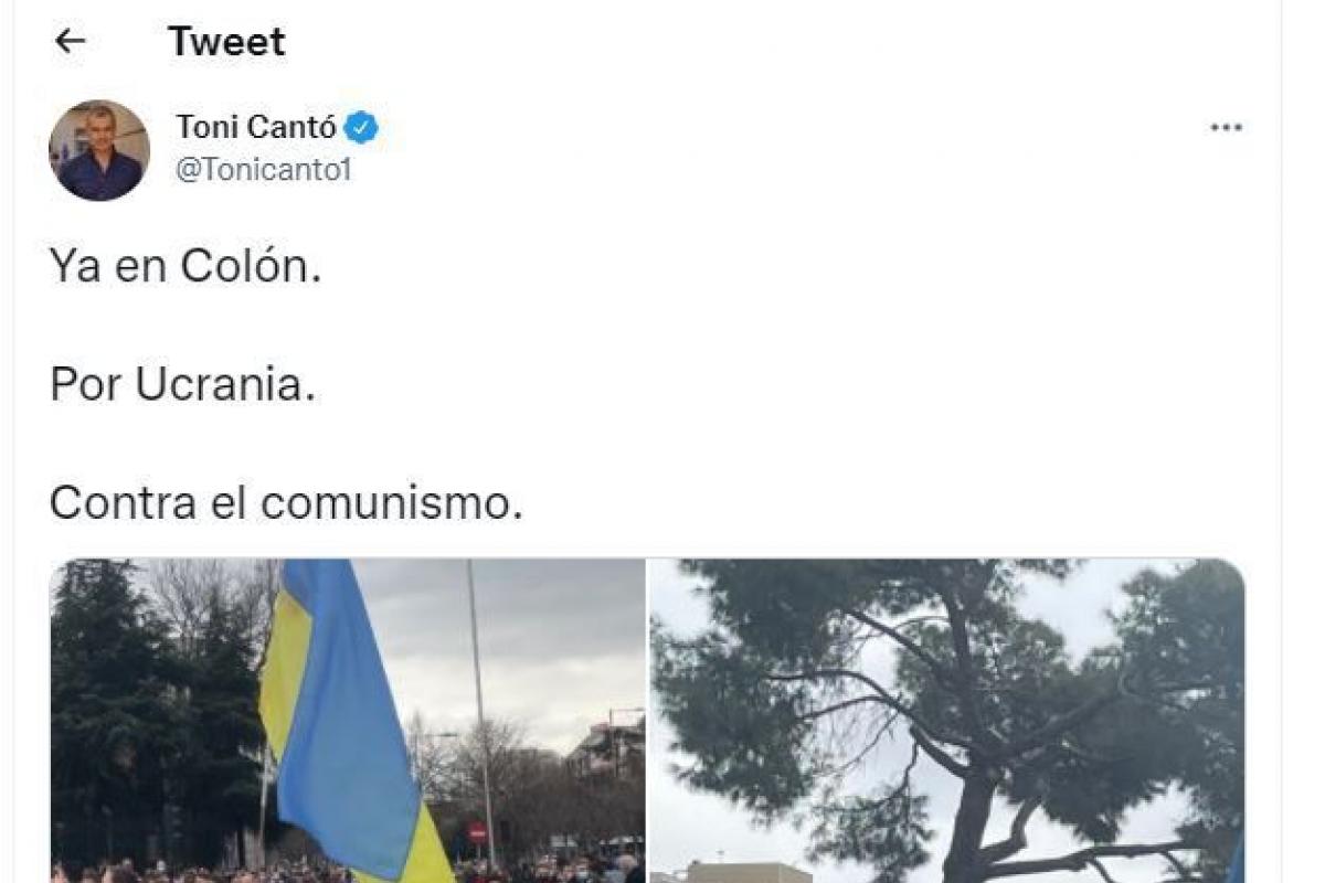 El domingo, una multitud de personas protestó en Madrid en contra de la invasión de Ucrania por parte de Rusia y Cantó, que estuvo presente allí, tuiteó: “Ya en Colón. Por Ucrania. Contra el comunismo”.
