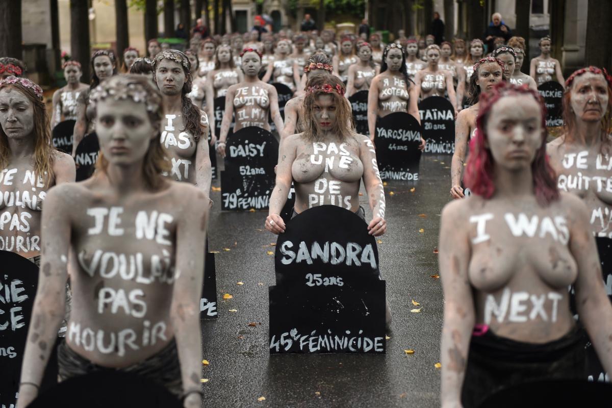 TOPSHOT - Femen activists hold placards shaped as tombstones, reading the name and the age of each women killed this year by their partner in 2019, during a protest action dedicated to the memory of the women killed by their partner or ex-partne...LUCAS BARIOULET via Getty Images