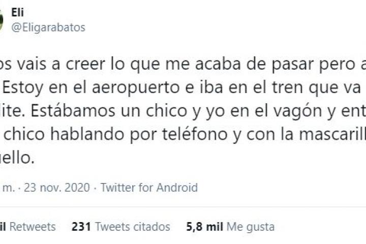La usuaria Elisa Garabatos ha relatado en Twitter lo que le ha ocurrido mientras estaba en un tren camino al aeropuerto. A su vagón, en el que estaba ella con un chico, entró otro que iba hablando por teléfono con la mascarilla por el cuello.