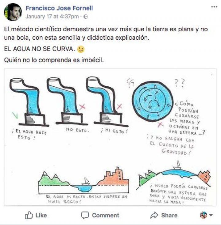 El post, publicado por Francisco José Fornell en su perfil de Facebook, asegura que la Tierra no es "una bola" porque "el agua no se curva". "El método científico demuestra una vez más que la Tierra es plana y no una bola, con esta sencilla y didáctica explicación", aseveraba este usuario, antes de añadir: "Quién (sic) no lo comprenda es imbécil".