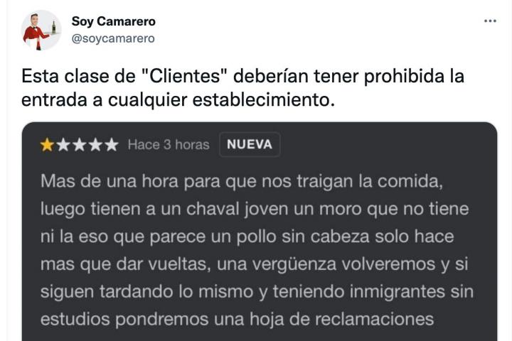 En el primer tuit publicado se muestra la reseña con tono racista que le hace el cliente al restaurante quejándose de que en el restaurante trabaja “un moro que no tiene ni la ESO”.