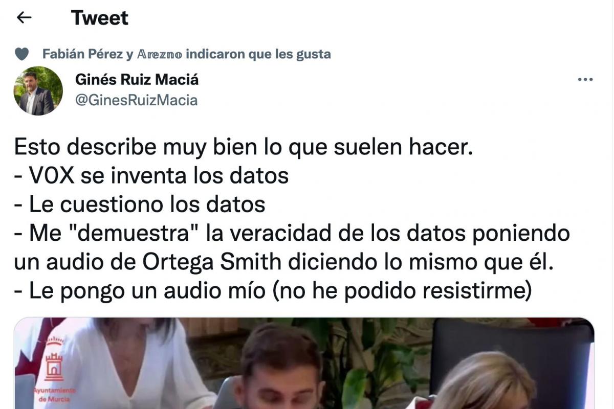 Hilarante momento el que se ha vivido en el Ayuntamiento de Murcia. El concejal de Podemos Ginés Ruiz Maciá ha compartido en su cuenta de Twitter el intercambio dialéctico que ha tenido con el edil de Vox José Ángel Antelo Paredes.