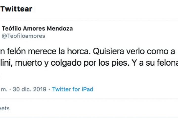 “El gran felón merece la horca. Quisiera verlo como a Musolini, muerto y colgado por los pies. Y a su felona igual”, ha escrito. Una frase por la que está siendo muy criticado en Twitter.