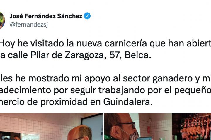“Hoy he visitado la nueva carnicería que han abierto en la calle Pilar de Zaragoza, 57, Beica. Allí les he mostrado mi apoyo al sector ganadero y mi agradecimiento por seguir trabajando por el pequeño comercio de proximidad en Guindalera”, ha explicado Fernández-Sánchez en Twitter.