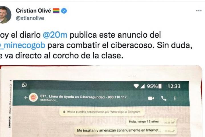 El docente ha compartido en su perfil un anuncio contra el ciberacoso publicado por el Ministerio de Asuntos Económicos y Transformación Digital en el periódico 20 Minutos.